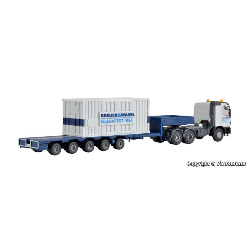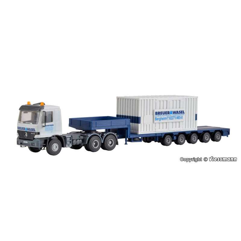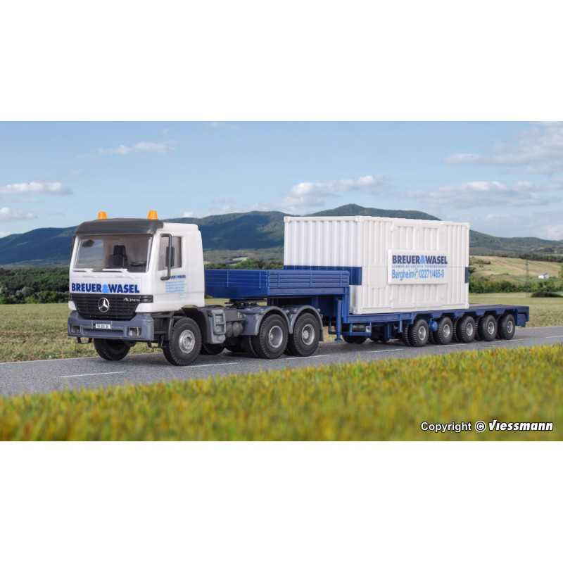 Kit. Este semirreboque plataforma com trator MB ACTROS de 3 eixos é um companheiro constante do guindaste de mastro treliçado LIEBHERR LG 1550, item 13061. Este veículo transporta os acessórios do guindaste durante a transferência do mesmo, por exemplo, para a construção de parques eólicos. Inclui porta-ferramentas. Com impressão tampográfica de alta qualidade. C 21,0 x L 3,5 x A 4,2 cm. Nível de dificuldade: 2 (avançado)