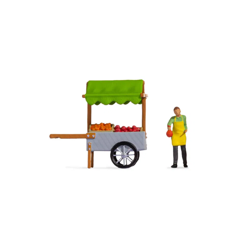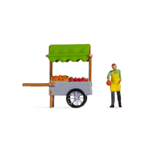 Com o Tiny-Scene 'Venda de fruta' você pode criar um mercado semanal maravilhoso no modelo. Este conjunto inclui uma barraca de frutas e um vendedor. A barraca de frutas marrom é coberta com um telhado verde e tem rodas para facilitar o transporte. Existem vários tipos de frutas dentro. O vendedor está vestindo um pulôver verde com punhos vermelhos. Ele também está vestindo calças escuras e um avental de trabalho amarelo. O homem está segurando um exemplar magnífico de suas variedades de frutas em sua mão.
