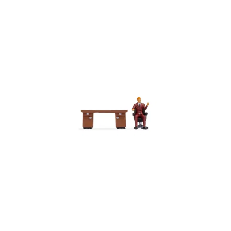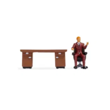 Com as Tiny Scenes você pode modelar uma cena quotidiana, como trabalho de escritório. Incluído nesta cena está um funcionário do sexo masculino vestindo terno marrom escuro, camisa branca e gravata. Ele se senta numa cadeira giratória e gesticula com as mãos. Há também uma mesa marrom com puxadores prateados nas gavetas e portas. Este pequeno conjunto é ideal para recriar uma cena quotidiana de escritório e é adequado para design de interiores de salas e edifícios de uma cena urbana.