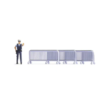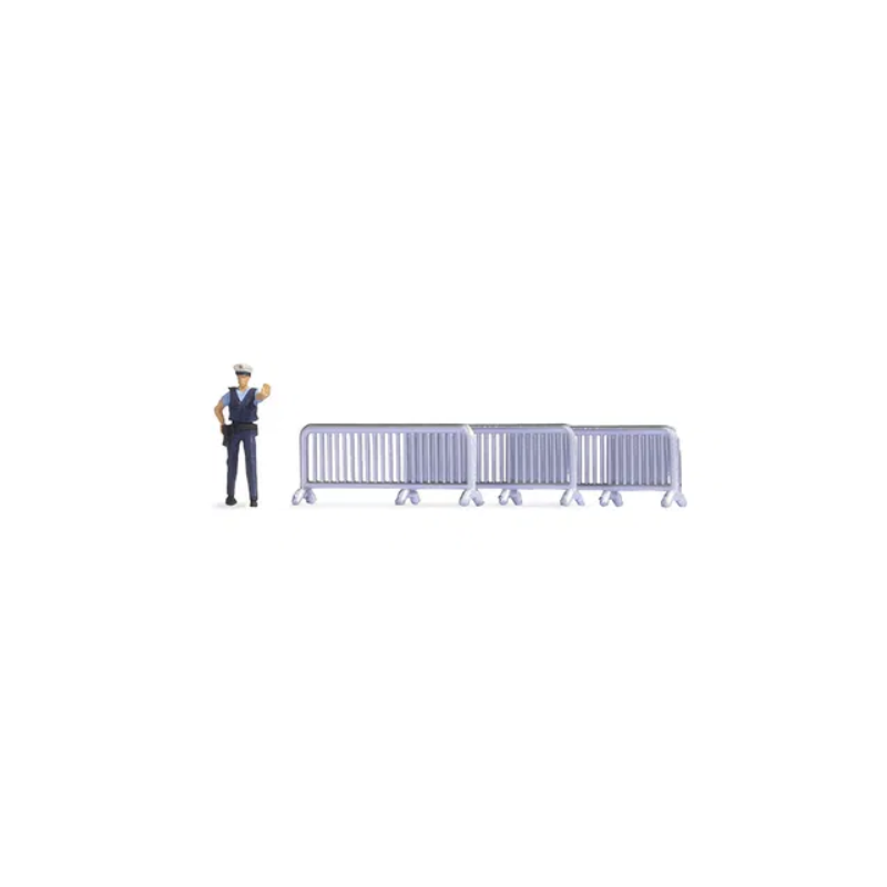 Com o Tiny Scenes você pode criar cenas realistas no modelo. Esta cena inclui um policial e três barreiras de prata. O policial está vestindo seu uniforme azul com boné pontudo. Ele estendeu a mão em alerta para parar um carro que se aproximava. Este pequeno conjunto é ideal para decorar um cenário urbano, como um evento ou demonstração. Dessa forma você pode animar ainda mais suas cenas.