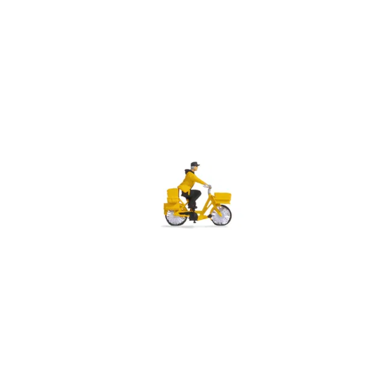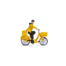 Com as Tiny Scenes você pode criar uma cena realista, como a vida profissional diária, como trabalhos de construção em edifícios ou ruas no modelo. Incluído nesta cena está um carteiro vestindo uma jaqueta amarela e boné de morcego. Ele anda em uma típica bicicleta postal amarela com cartas transportadas na frente e atrás.