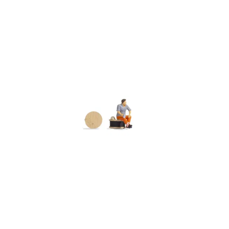 Com as Tiny Scenes você pode criar uma cena realista, como esperar na estação de trem ou no hall de entrada. Nesta cena, um trabalhador senta-se em um carretel de cabo e toma um café enquanto faz uma pausa. O trabalhador está vestindo calça de trabalho laranja e camisa de trabalho. Um rolo de cabo adicional também está incluído no conjunto.