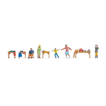 4 clientes, 1 vendedor sentado, 1 mesa grande com tecidos e sapatos, 3 mesas pequenas com tecidos e sapatos