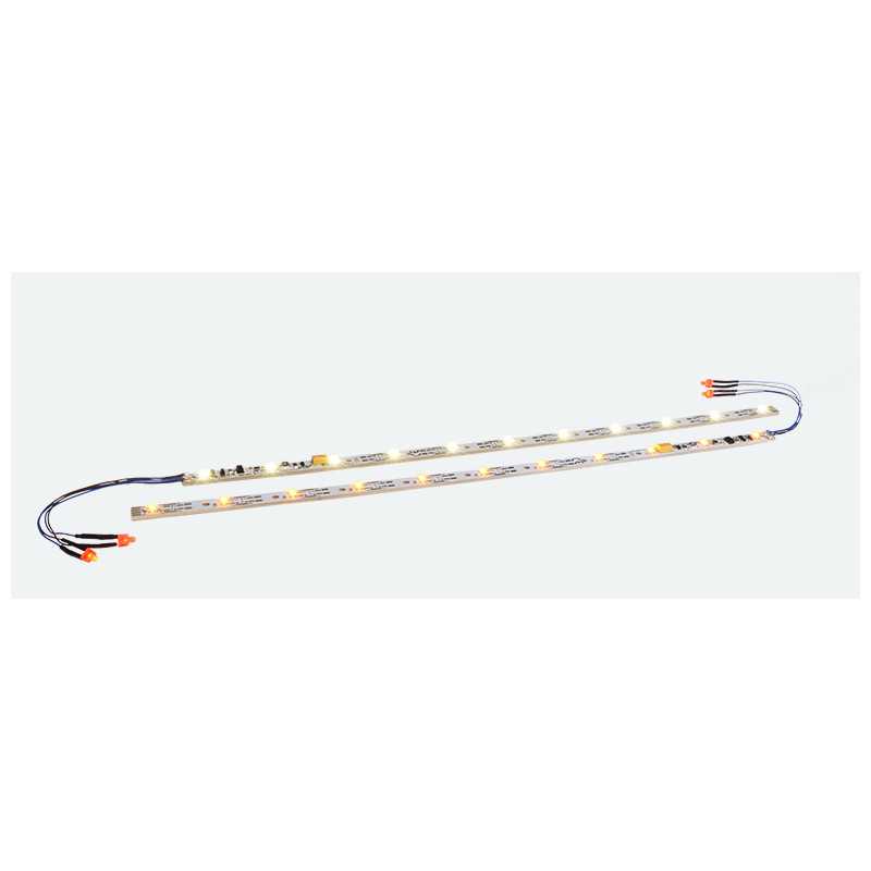 AAs faixas de iluminação LED de 255 mm de comprimento e 9 mm de espessura com 11 LEDs são projetadas para carros de bitola N, TT e H0 que serão operados em ferrovias modelo digital. Estamos oferecendo duas versões: a versão com número de peça 50708 é equipada com LEDs branco quente, enquanto na peça número 50709 instalamos LEDs amarelos. Isso lhe dará a opção de combinar as faixas de iluminação com seus carros existentes. Como de costume para todas as faixas de iluminação ESU, você pode ajustar o brilho de acordo com seus desejos com a ajuda de um pequeno resistor variável (potenciômetro). Graças ao controle de voltagem integrado, o brilho permanece quase constante mesmo durante a condução convencional. Para superar interrupções prolongadas de energia, você pode adicionar um PowerPack. Claro, as faixas de iluminação podem ser cortadas arbitrariamente para se ajustarem aos carros de todos os fabricantes e vêm com uma luz traseira vermelha.