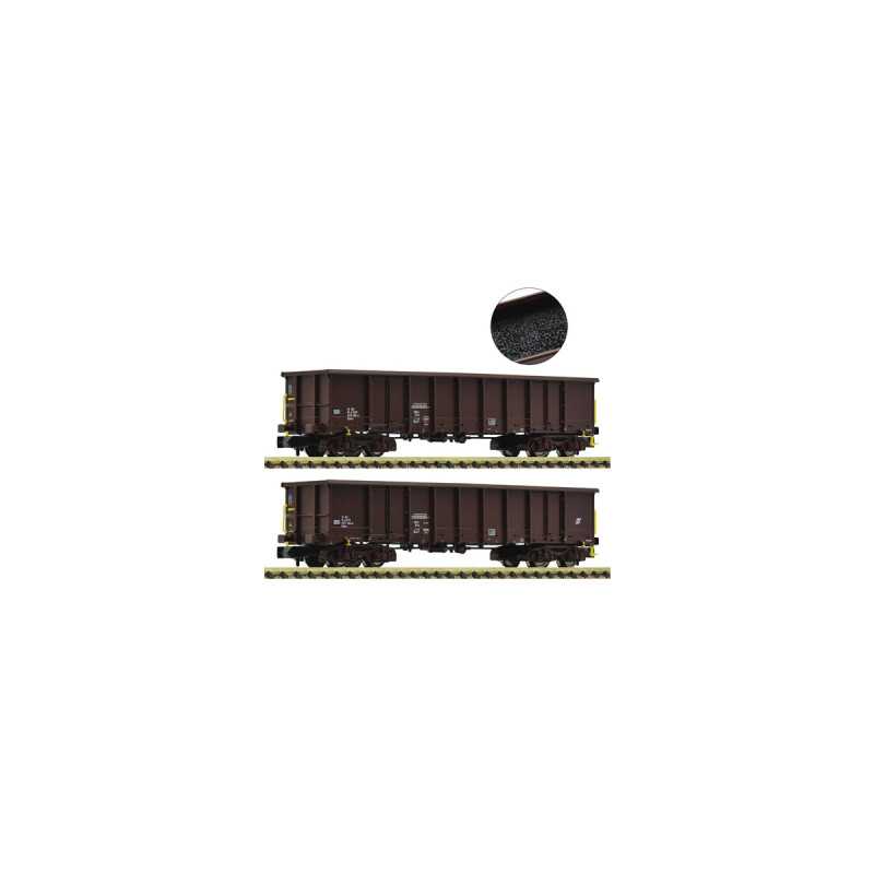 Conjunto de vagões com dois vagões de mercadorias abertos de quatro eixos do tipo Eanos da Ferrovia Federal Austríaca.